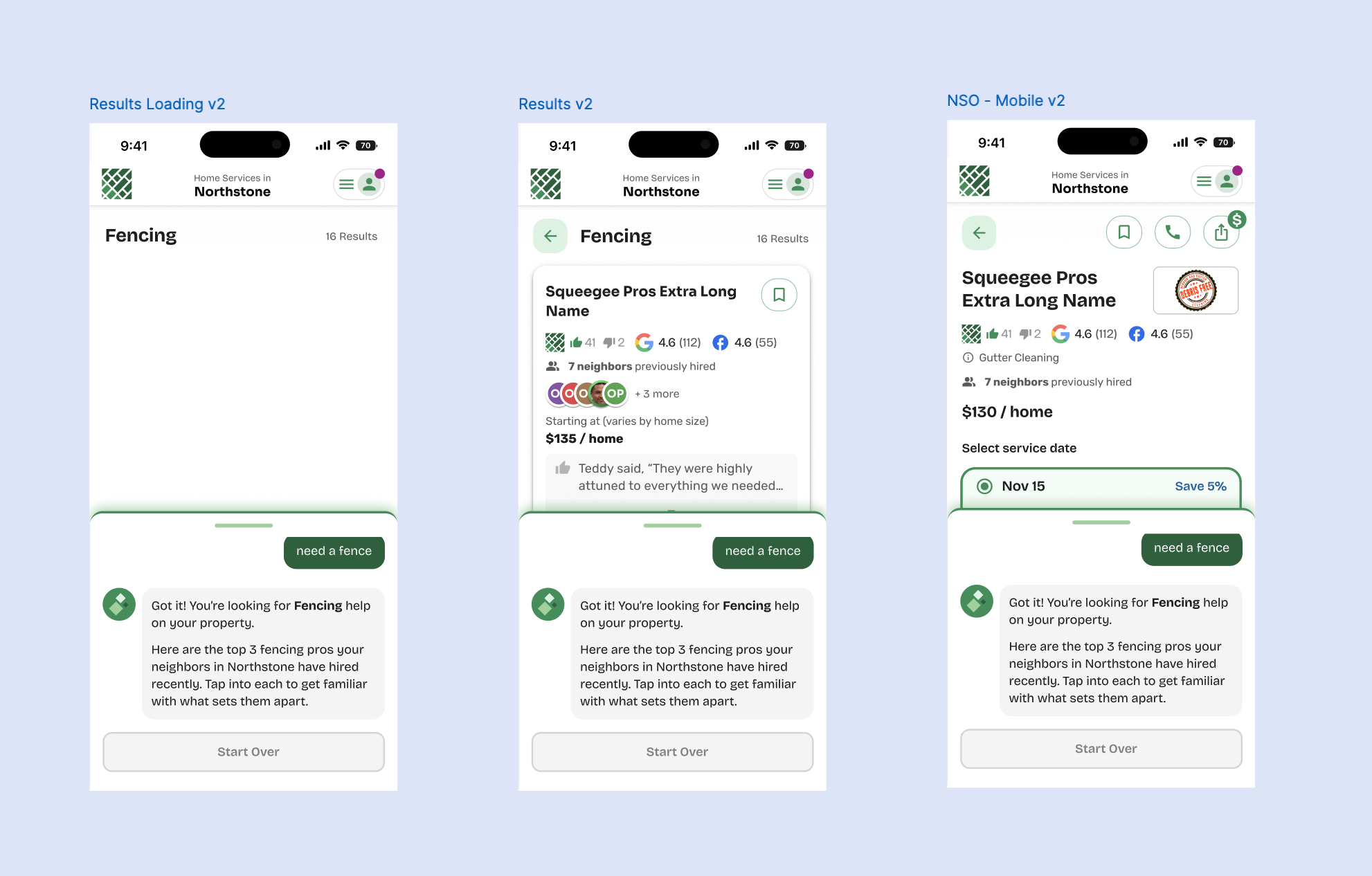 Users liked getting one primary pro suggestion with a few alternatives. We also added follow‑up questions when details could change the recommendation, for example suggesting a Handyman instead of Siding or Exterior for small siding damage.
