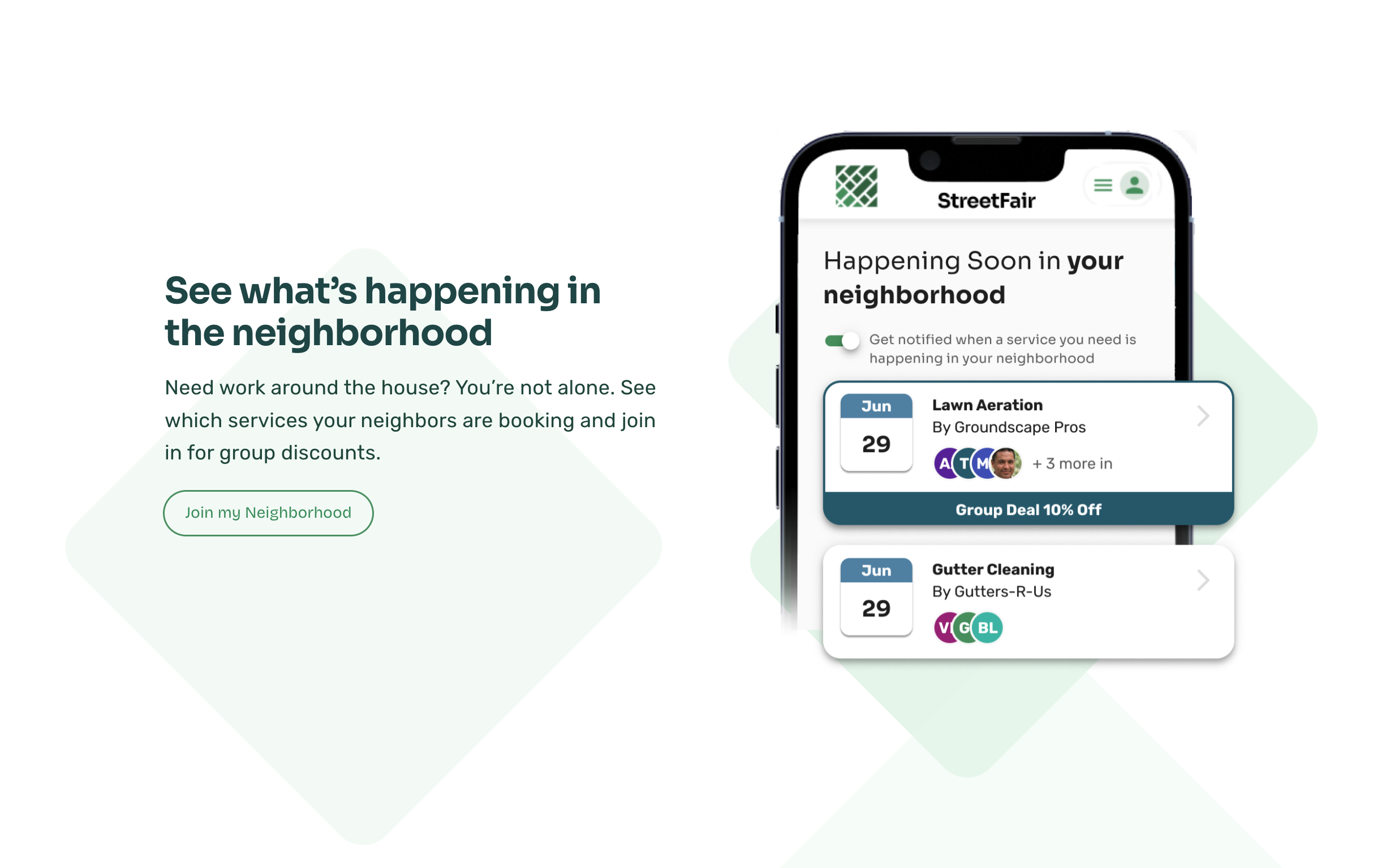 Full design system codification and extension, consumer and back-office for StreetFair, a home services marketplace for neighborhoods.